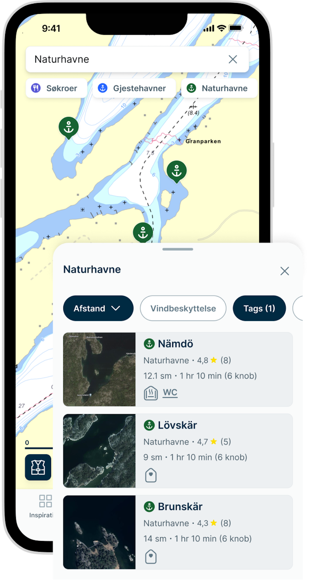 Gør det nemt at finde den perfekte destination for dig og din båd. Skippos smarte hurtigsøgning viser havne, søkroer og søtanke direkte på søkortet, og du kan nemt filtrere på ankringstype, vindretning og faciliteter.